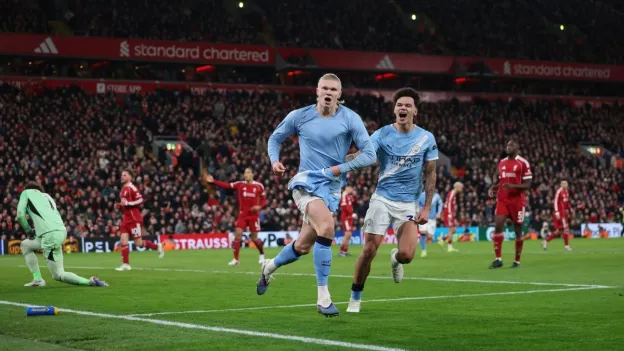 Manchester City's thrilling 2-1 victory over Liverpool keeps the Premier League title race alive. Dominik Szoboszlai's free kick, Erling Haaland's penalty, and VAR controversies highlighted the match at Anfield.