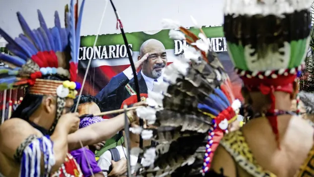 Former soldiers in uniform placed a Surinamese flag on the coffin, flanked by four indigenous men in traditional attire. The open casket was then carried to a white hearse that will transport Bouterse to his party's headquarters, a 40-kilometer journey. Many attendees wore camouflage clothing, while others donned T-shirts bearing the image of the late ex-president. Dozens of cars joined the funeral procession.